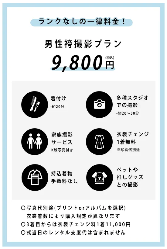 女性も男性も撮影料変わらず2着までお仕度できます。3着目からは1着につき¥11,000のチェンジ料が必要です。 ※お写真代は1着につき2枚以上のご購入となりますのでご注意下さい(例:2着の場合1人のお写真が4枚~)