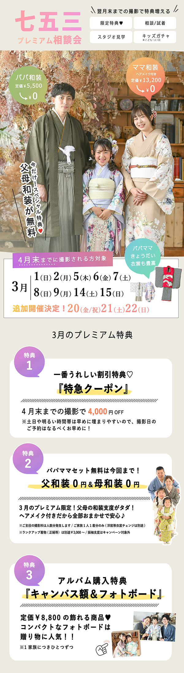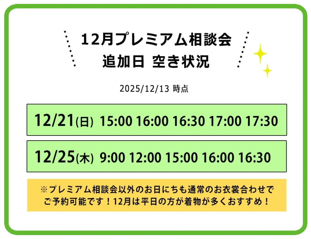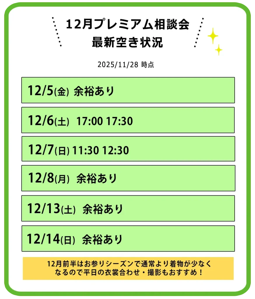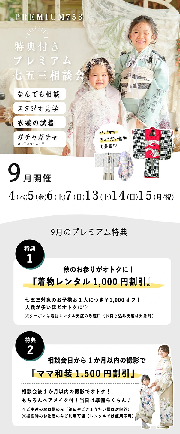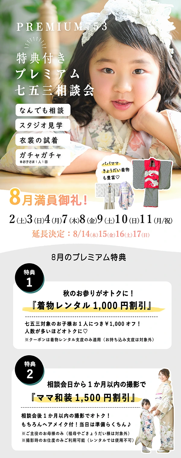 七五三のお衣裳合わせ・ご相談は相談会以外のお日にちでもいつでも可能です。どちらの場合もご予約制になりますのでお気軽にお問い合わせください。(※プレミアム特典は開催日来場のみ)