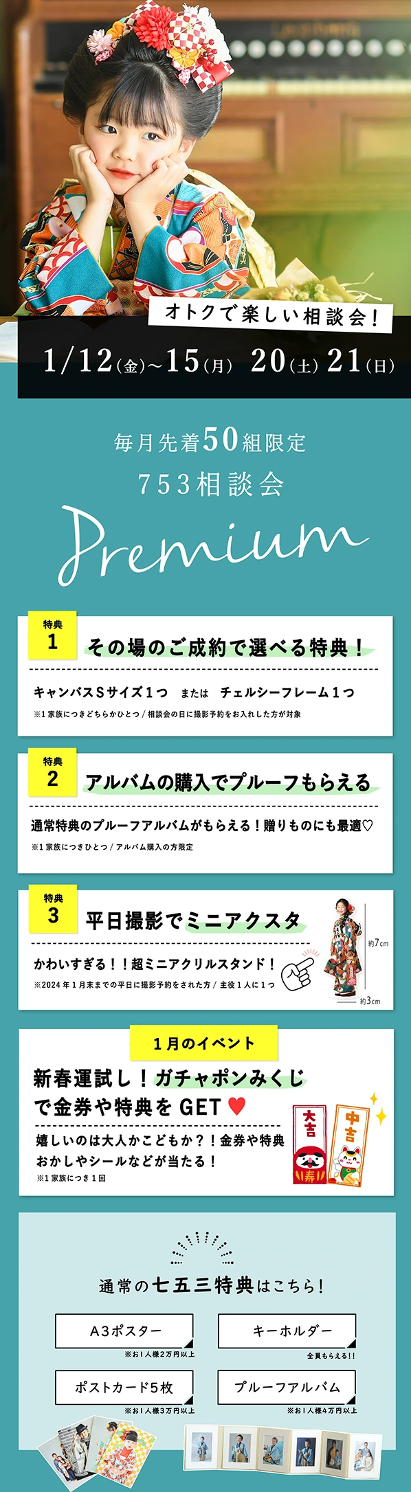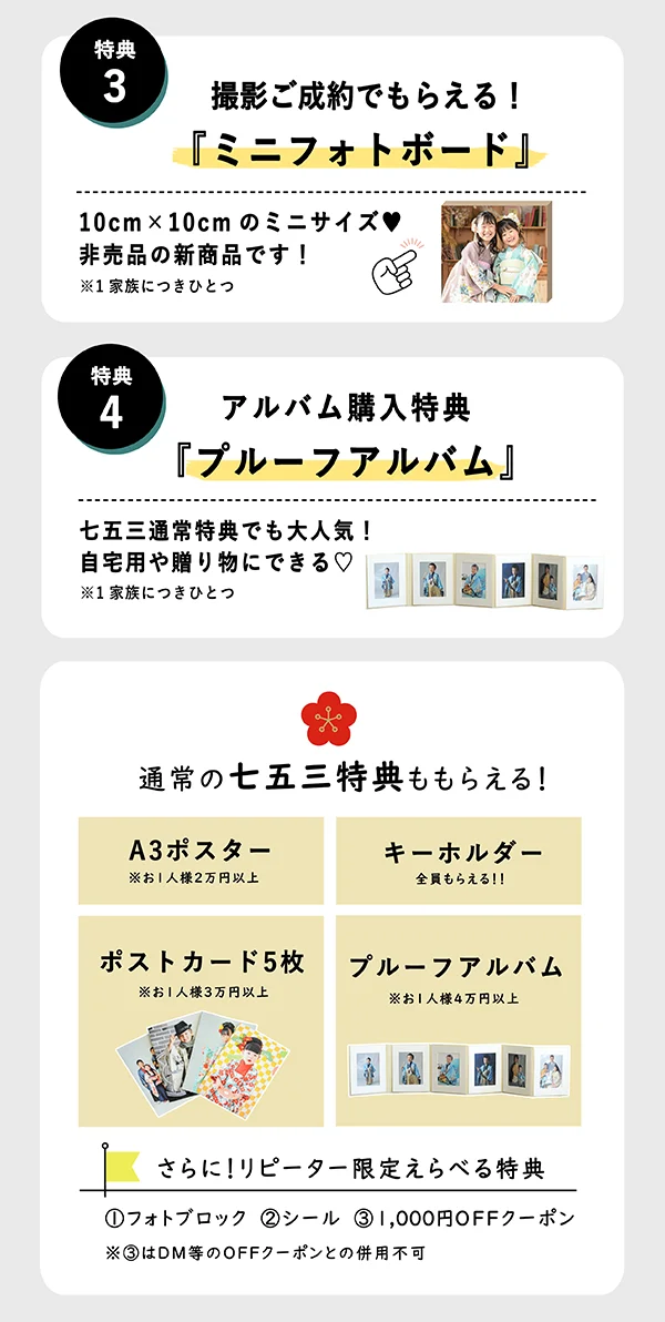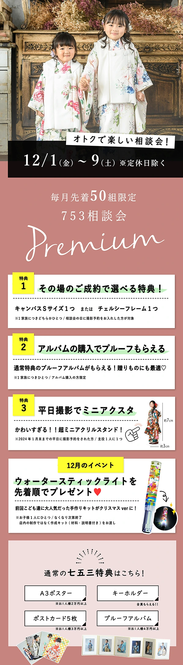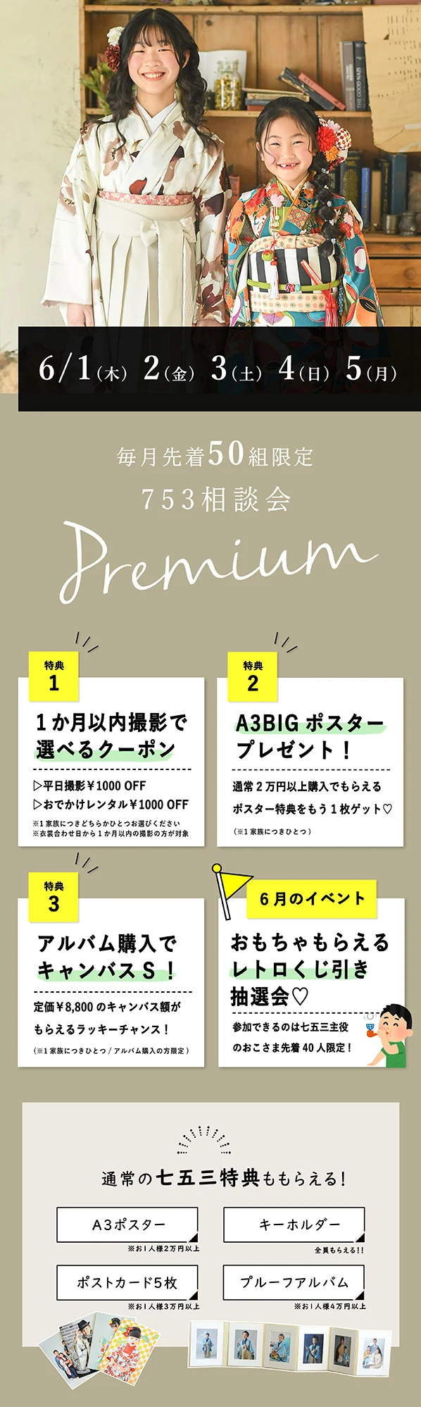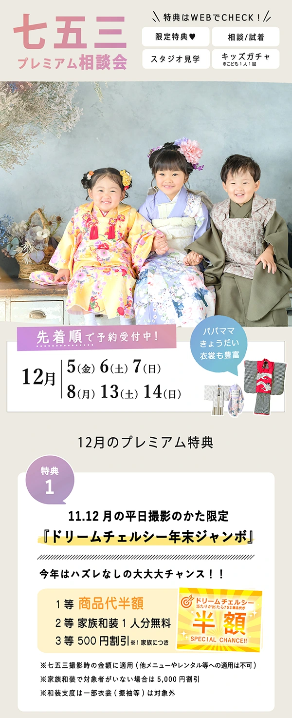 通常の衣装合わせの内容(料金相談/スタジオ見学/衣裳試着)は同じです。開催日は七五三の通常特典にさらにプレミアム特典が付く形になります。遊びイベントが開催されてる月も♪