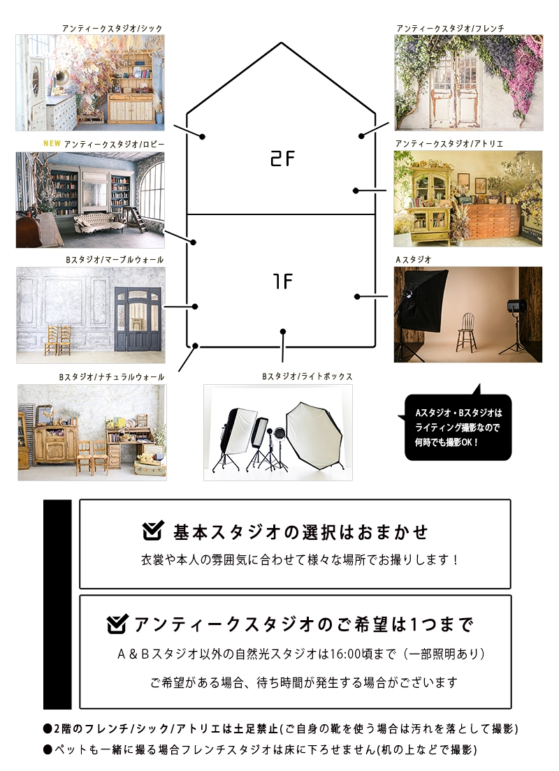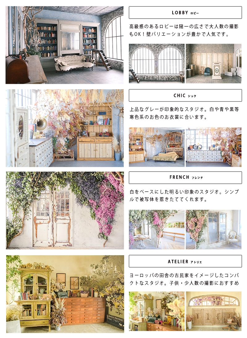 4つの自然光アンティークスタジオはコンセプトが異なり